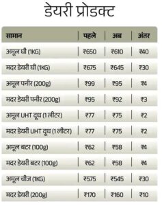नई दिल्ली: आज यानी 22 सितंबर से घी, पनीर और कार खरीदने से लेकर AC खरीदना भी सस्ता हो गया है। सरकार ने 3 सितंबर को GST में कटौती का ऐलान किया था, जो आज से लागू हो गई है। अब केवल दो स्लैब में जीएसटी लगेगा- 5% और 18%। सरकार ने टैक्स सिस्टम को आसान बनाने के लिए ऐसा किया है। GST काउंसिल की 56वीं मीटिंग में इस पर फैसला लिया गया था। ग्राफिक्स में देखें रोजाना इस्तेमाल का कौनसा सामान कितना सस्ता हुआ। कुछ कंपनियों ने नए रेट जारी नहीं किए हैं। इसलिए उनकी अनुमानित MRP दी गई हैं। इसमें कंपनियों और सेलर्स द्वारा दिया जाने वाला डिस्काउंट शामिल नहीं है। ऐसे में मार्केट में मिलने वाले सामानों की कीमत और ज्यादा कम हो सकती है।