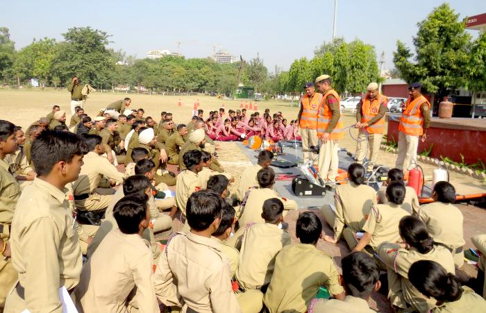 पंचकूला: पुलिस कमिश्रर शिवाश कविराज के निर्देशानुसार पुलिस उपायुक्त सुमेर प्रताप सिह के नेतृत्व में गुरुग्राम भौंडसी स्थित इंडियन रिजर्व बटालियन की एसडीआरएफ टीम नें एक दिवसीय शिविर का आयोजन किया गया। जहां पुलिस कर्मचारियो, होमगार्ड, एसपीओ, एनसीसी तथा पुलिस डीएवी पुलिस पब्लिक स्कूल के विधार्थियो को आपदा प्रंबधन के साथ प्राथमिक चिकित्सा के उपायो की जानकारी दी। पुलिस प्रवक्ता नें जानकारी देते हुए बताया कि एसडीआरएफ टीम के इन्सपेक्टर सतीश कुमार नें प्राकृतिक आपदाओं में बचाव के तरीके सिखाए और भूंकप, बाढ व अन्य प्राकृतिक आपदाओं में बचावे हेतु जानकारी दी गई। इसके साथ ही इन्सपेक्टर सतीश कुमार नें बताया कि स्टेट डिजास्टर रिस्पोंस टीम (एसडीआरएफ) द्वारा जिला में सरकारी व प्राईवेट स्कूलो के साथ पुलिस विभाग में प्रशिक्षण दिया जा रहा है जिसका मुख्य उदेश्य है लोगो की आपदा के समय खुद के साथ साथ दुसरो की मदद करके जान बचाना और आपदा के समय किसी प्रकार का ज्यादा जान माल का नुक्सान ना हो। इसके लिए पुलिस विभाग के साथ साथ स्कूल के बच्चो को भी प्रशिक्षण बहूत जरुरी है ताकि बच्चे डरें नही और इस प्रैक्टिल ट्रेनिंग को ध्यान में रखते हुए खुद को बचा सके।