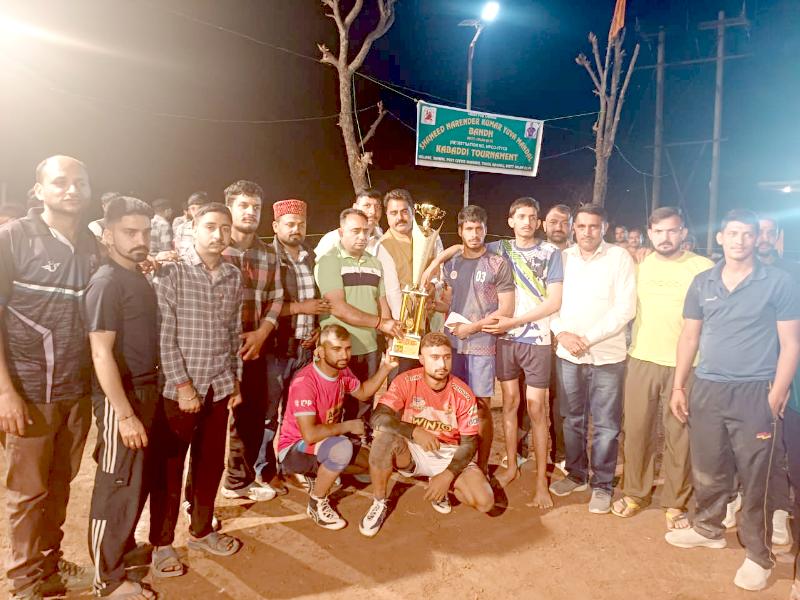 शहीद नरेंद्र कुमार युवा मंडल बांध के अध्यक्ष मुकेश वर्मा ने बताया के एक दिवसीय कब्बडी प्रतियोगिता में कुल 12 टीमों ने हिस्सा लिया। फाइनल मुकाबले में जियोंग कैथल की टीम ने पट्टा महलोग को हराकर कब्बडी कप अपने नाम करवाया। इस मौके पर मुख्यातिथि गुरमेल चौधरी के साथ, मंडलाध्यक्ष मान सिंह मेहता, युवा मोर्चा अध्यक्ष सुरेंद्र ठाकुर, गोपाल चौधरी, शहीद नरेंद्र कुमार युवा मण्डल के अध्यक्ष मुकेश वर्मा, मनीष ठाकुर, रोहित ठाकुर, हर्ष कुमार, यशपाल, लोकेश, जतिन, गौरव, घनश्याम, सोनी, अमन, रोहित, हितेश, हरीश, बंटी, गौरव ठाकुर, करण, अमन, अर्जुन, अजय, विजय, त्रिलोक, रिशव मेहता, निशांत मेहता, भूपेंद्र, अरुण, अमित मेहता, दीपक मेहता,दीपक, धीरज उदय, आदि उपस्थित रहे।