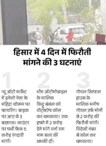 हरियाणा के हिसार में फिरौती के लिए धमकी-फायरिंग व्यापारी भड़क गए हैं। उन्होंने 4 दिन में 3 बड़े व्यापारियों से रंगदारी मांगे जाने को लेकर बाजार बंद करने का ऐलान कर दिया है। उन्होंने पुलिस को 72 घंटे का समय दिया था लेकिन पुलिस बदमाशों का पता नहीं लगा पाई। जिसके बाद आज शुक्रवार को ऑटो मार्केट और अनाज मंडी व्यापारियों ने दुकानें बंद कर दी हैं। गुरुवार शाम को व्यापारी नेता बजरंग दास गर्ग ने पूरी मार्केट में मुनादी करवाकर व्यापारियों से सहयोग मांगा। बजरंग दास गर्ग ने कहा कि जब तक सरकार अपराधियों पर पक्का चीरा नहीं लगाती, इन पर अंकुश लगाना मुश्किल है।