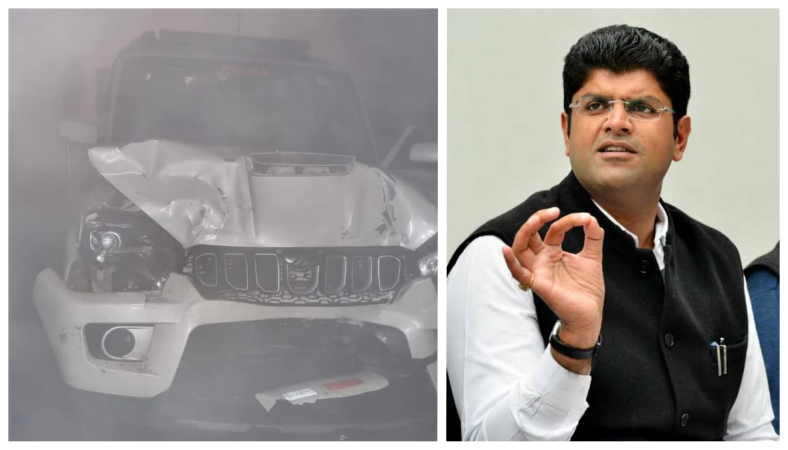 हरियाणा के हिसार में घनी धुंध के कारण उप मुख्यमंत्री दुष्यंत चौटाला के काफिले की टक्कर हुई है। हिसार से सिरसा जाते वक्त देर रात अग्रोहा के नजदीक यह सड़क हादसा हुआ है। राहत की खबर यह है कि इस हादसे में दुष्यंत चौटाला बाल-बाल बचे हैं लेकिन काफिले में सवार पुलिस कमांडो को चोटें आई हैं। जानकारी के अनुसार, काफिले में चल रही पुलिस की बोलेरो के अचानक ब्रेक लगाने के कारण गाड़ी टकराई है।
